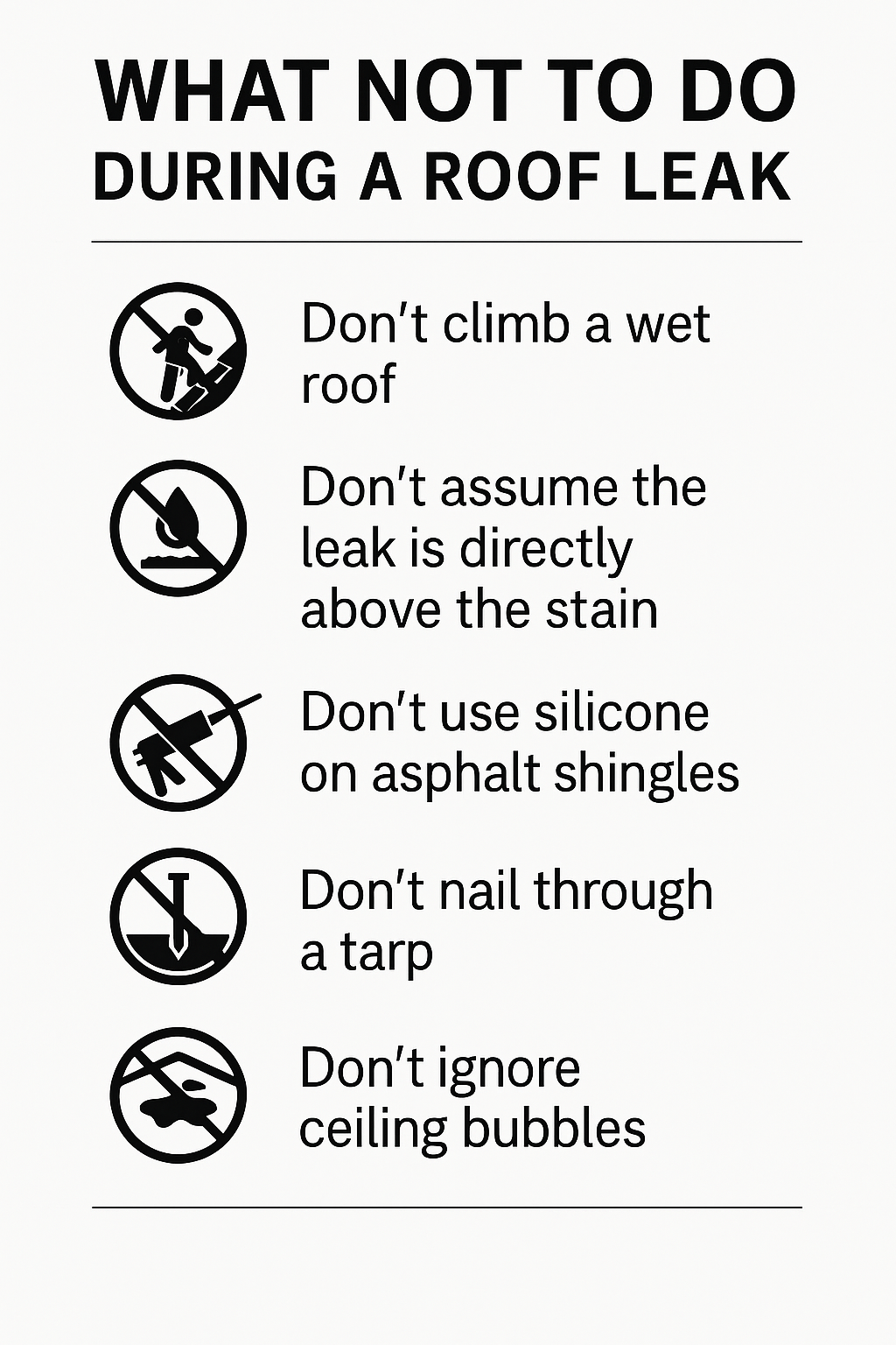 Before we move into the final steps and long-term recommendations, it’s important to understand the common mistakes homeowners make during a roof leak. These errors can worsen the situation, increase repair costs, or create dangerous safety hazards. Use this quick reference to avoid making the leak worse: